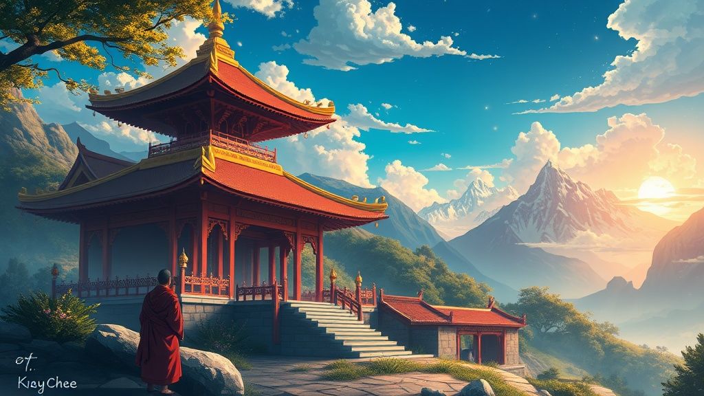 Tenzin, a wise and serene Buddhist monk, stood at the entrance of the temple, his gaze sweeping over the verdant landscape that stretched endlessly beyond the temple grounds. The air was thick with the sweet scent of jasmine, and the distant hum of a nearby waterfall added a rhythmic tranquility to the atmosphere.