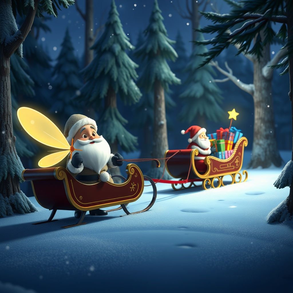 As Luna zipped through the trees, she noticed something unusual in the clearing ahead. There, standing beside a grand sleigh, was Santa, his red suit vibrant against the snow. His beard was as white as the freshly fallen snow, and his eyes twinkled with a kind of joy that Luna had only ever imagined. "Well, who do we have here?", Santa chuckled, spotting the curious firefly. "I'm Luna, and I've never seen anything like this!", she exclaimed, her light flickering with excitement.
