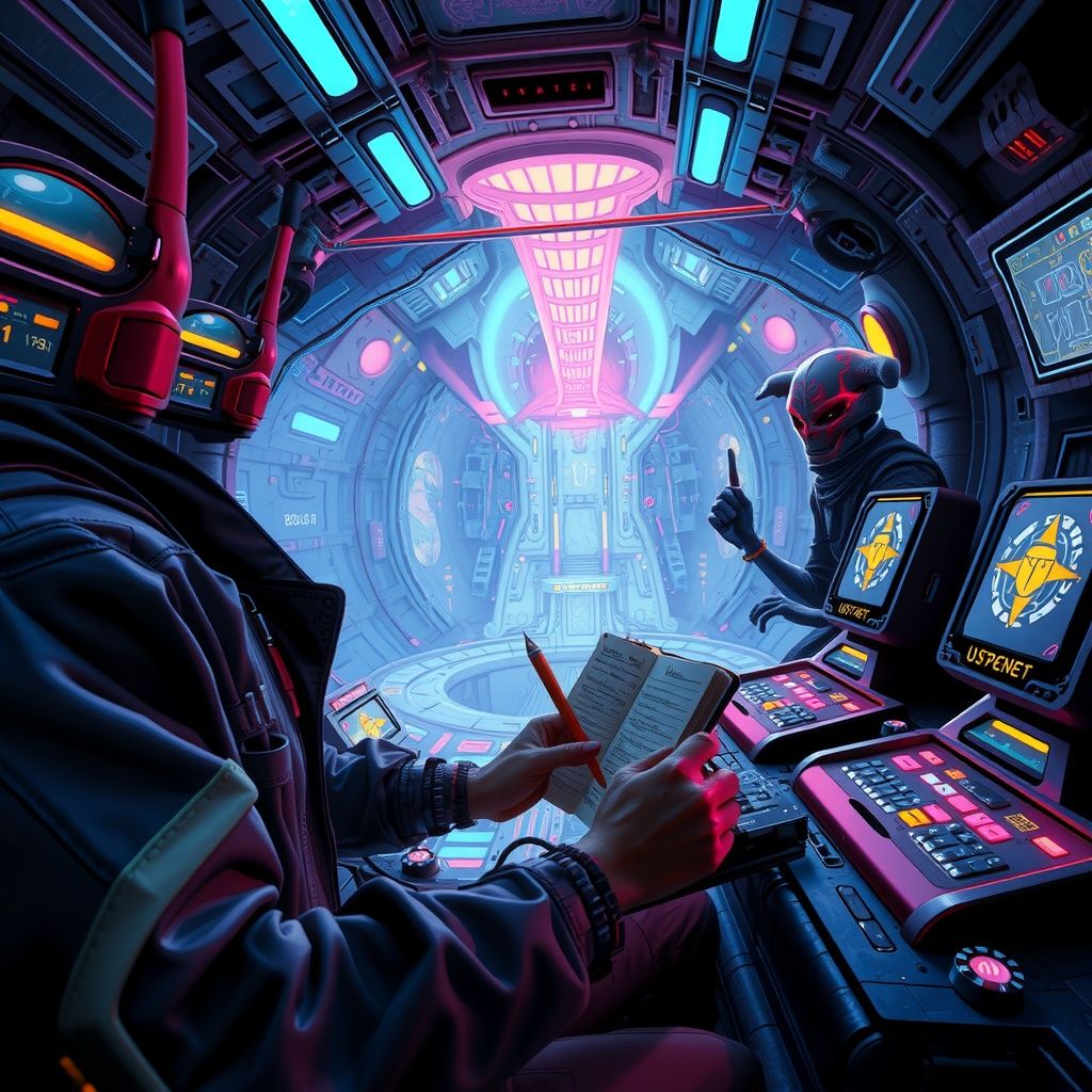 Alone in the heart of an alien vessel, I scribble furiously in my journal, the only human relic I possess. The stark, otherworldly light from the ceiling reflects on the pages, a reminder of how foreign everything around me is. I am surrounded by an array of incomprehensible gadgets and screens displaying unintelligible data streams, each a testament to the advanced civilization that has plucked me from Earth’s demise. My mind races with questions. Why have they saved me? What do they want in return?