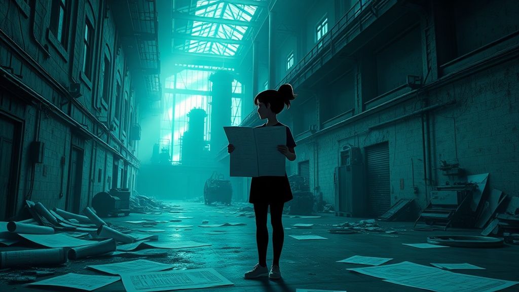 Maya, her once vibrant eyes now dimmed by years of solitude and regret, wandered through the abandoned factory. The air was thick with the scent of rust and forgotten dreams. Her fingers traced the brittle edges of a forsaken blueprint, its lines an intricate dance of innovation and hope.
